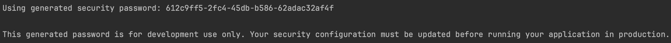 dependencies{ compileOnly "org.springframework.boot:spring-boot-starter-security" }의존성 추가 후 서버를 실행하면 이렇게 자동으로 security password가 생성된다.