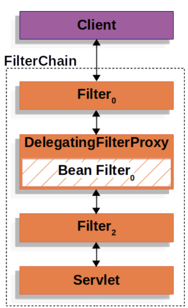 public void doFilter(ServletRequest request, ServletResponse response, FilterChain chain){ // do something before th rest of the application chain.doFilter(request, response); // invoke the rest of the application // do something after the rest of the application }> DelegatingFilterProxy : Servlet 컨테이너의 라이프사이클과 스프링 ApplicationContext 사이의 연결을 허용하는 필터 구현체