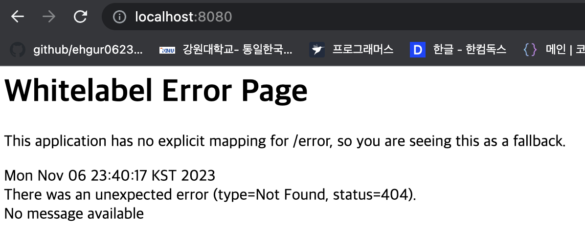 아직 기본 화면조차 만들지 않아 404 에러가 뜨는 모습 application.properties에서 내가 직접 스프링 시큐리티 이름과 비밀번호를 설정해 줄 수도 있다.
