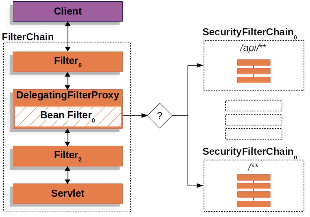 > FilterChain : Servlet 컨테이너가 관리하는 ApplicationFilterChain( =/= SecurityFilterChain)
