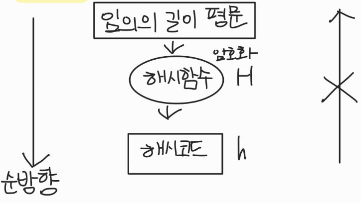 - 해시코드에 대응되는 데이터를 거꾸로 찾는 것은 어렵다.