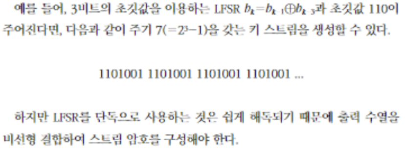 - 의사 난수 생성기 : 스트림 암호에서 키 생성 의사 난수 사용 -> land()