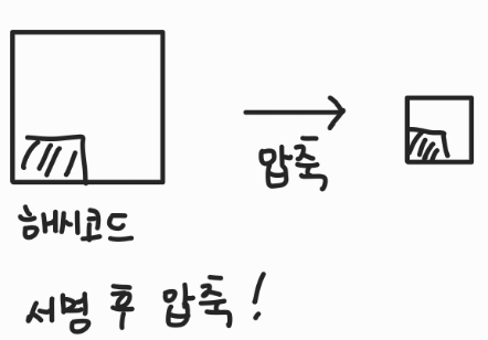 - 해시함수 이용 : 메시지에 의존하지만 작은 크기의 서명을 생성