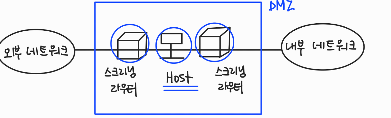 - 두 개의 스크리닝 라우터와 배스천 호스트를 이용하여 중립적인 비무장지대