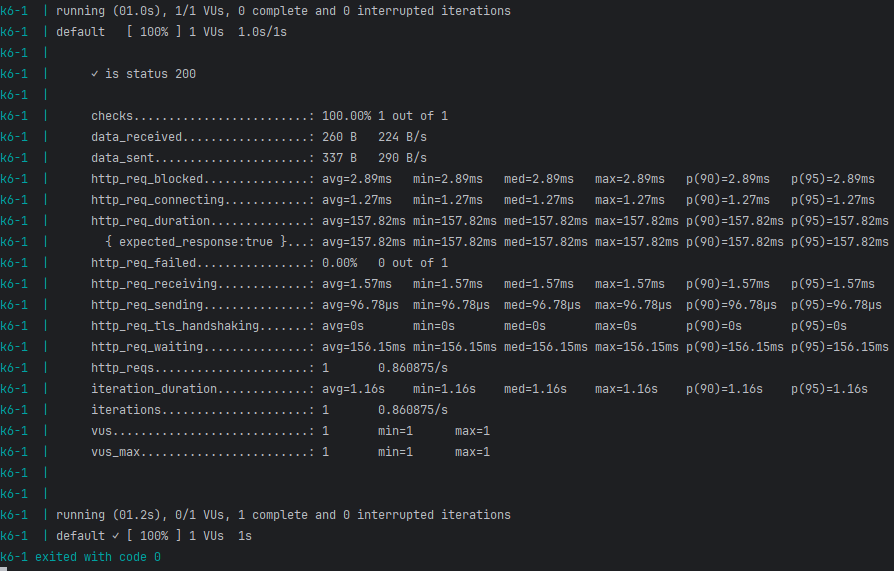 import http from 'k6/http'; import { check, sleep } from 'k6'; import {encode} from "./util.js"; export const options = { vus: 1, duration: '1s', }; export default function() { const data = { "sub" : "abc@naver.com", "auth" : "손님,회원", "exp" : Date.now() + 1800000 } const acc = encode(data, SECRETE_KEY); console.log(acc); const response = http.get("http://host.docker.internal:8080/v1/api/auth/test", { headers: { 'Content-Type': 'application/json', 'Authorization' : `Bearer ${acc}` } }); check(response, { "is status 200" :(r) => r.status === 200 }) sleep(1); }