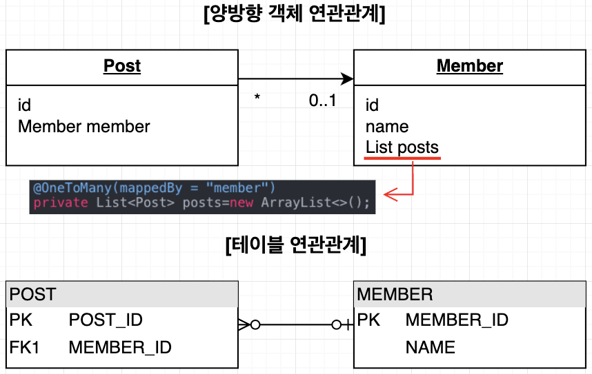 @Entity public class Post { @Id @GeneratedValue private Long id; @ManyToOne @JoinColumn("member_id") private Member member; } @Entity public class Member { @Id @GeneratedValue private Long id; private String name; @OneToMany(mappedBy = "member") List<Post> posts = new ArrayList<>(); }여기서 중요하게 봐야할 것은 @OneToMany 어노테이션에 mappedBy 값이다.