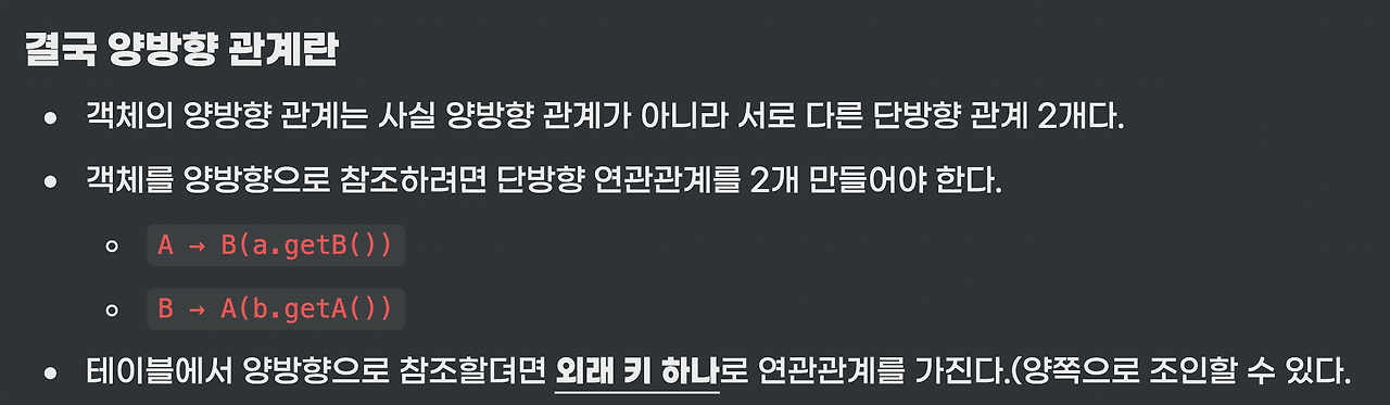 사실 객체에서는 양방향 연관관계라는건 없다.