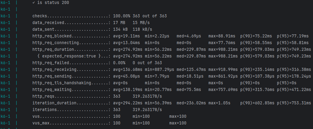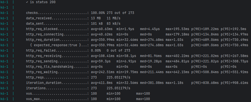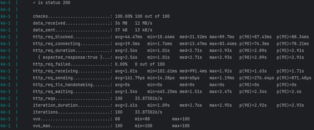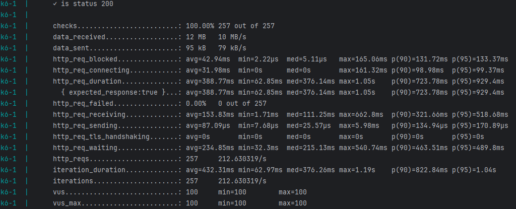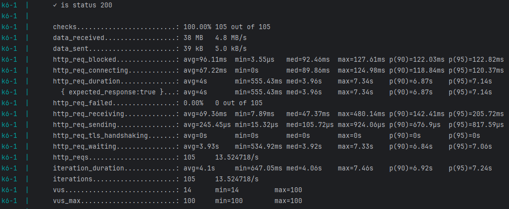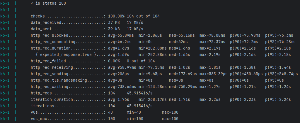 http_req_duration에 P(90)과 P(95)가 2.x초인 것을 볼 수 있다.