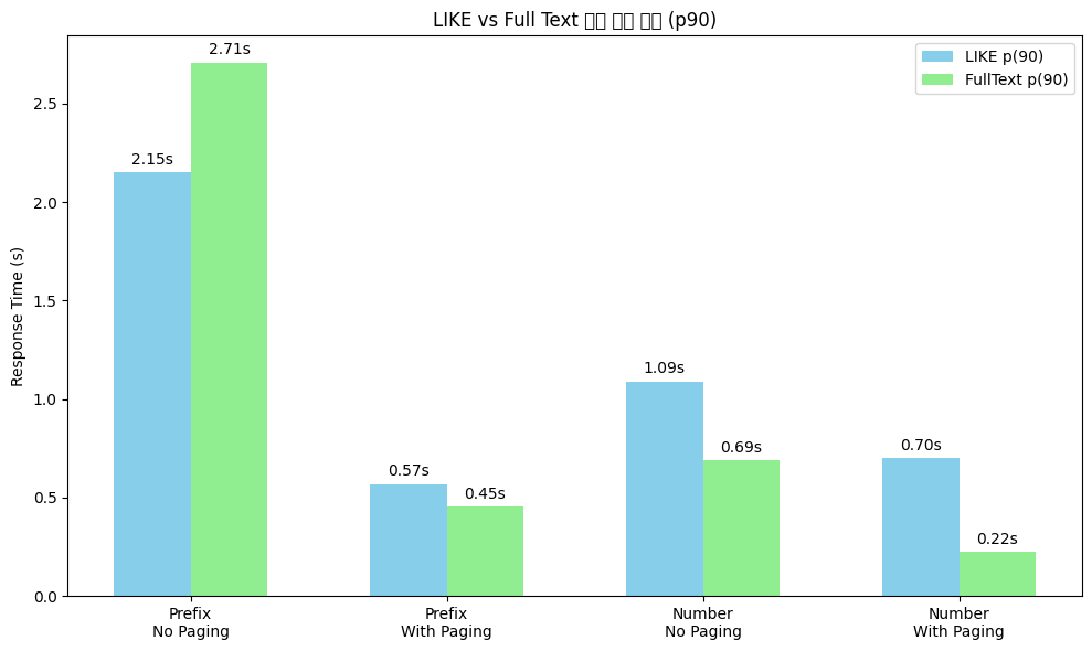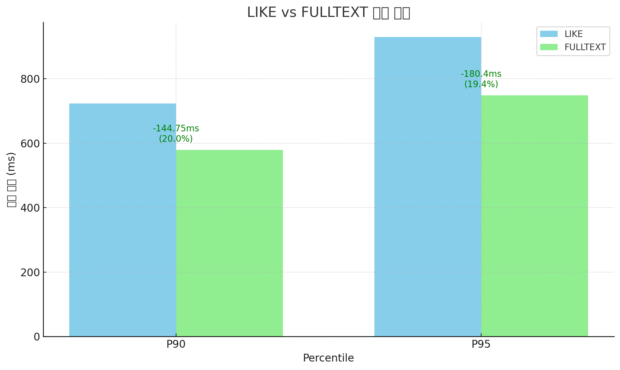Percentile LIKE FULLTEXT 성능 향상 (ms) 성능 향상 (%) P90 723.78 ms 579.03 ms 144.75 ms 약 20.0% 빠름 P95 929.4 ms 749.0 ms 180.4 ms 약 19.4% 빠름