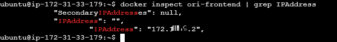 ori-frontend 컨테이너 IP 확인 결과를 보면 모자이크 처리 되어있지만 172.xx.x.2 IP를 사용하고 있다.