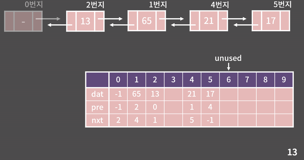 구현에 필요한 변수들을 보면 dat[i]는 i번지 원소의 값, pre[i]는 i번지 원소에 대해 이전 원소의 인덱스, nxt[i]는 다음 원소의 인덱스이다. pre나 nxt의 값이 -1이면 해당 원소의 이전/다음 원소가 존재하지 않는다는 의미이다. unused는 현재 사용되지 않는 인덱스,