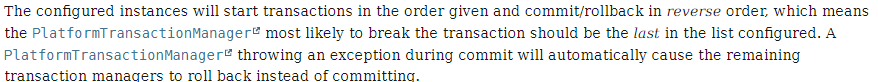 트랜잭션 시작 txManager1.begin() txManager2.begin() 커밋 / 롤백(역순) txManager2.commit() txManager1.commit()javadoc을 보면 가장 깨질 가능성이 높은 트랜잭션 매니저를 마지막에 둬야한다고 되어있다.