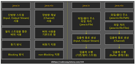 둘의 차이를 쉽게 말하면 IO의 기능들을 개선하고 새로운 기능을 추가(대표적으로 비동기 / Non-Blocking 지원)하여