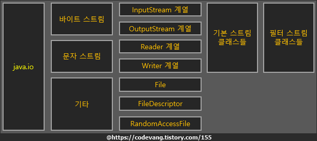 - 단, 워낙 기능이 다양하고 사용법도 복잡한 편이므로 간단한 작업은 IO 패키지의 File 클래스를 사용하는 것이 편하다.