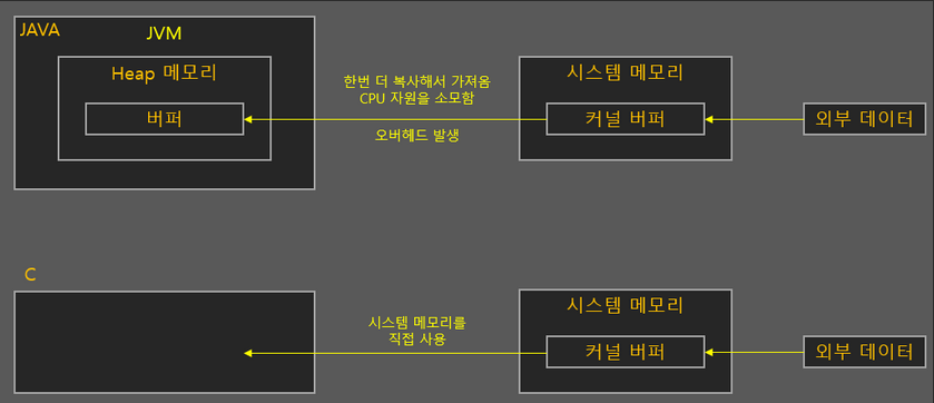 allocateDirect()로 생성하는 버퍼 외에는 모두 커널 버퍼가 아닌 JVM 내에서 생성되는 버퍼이다.